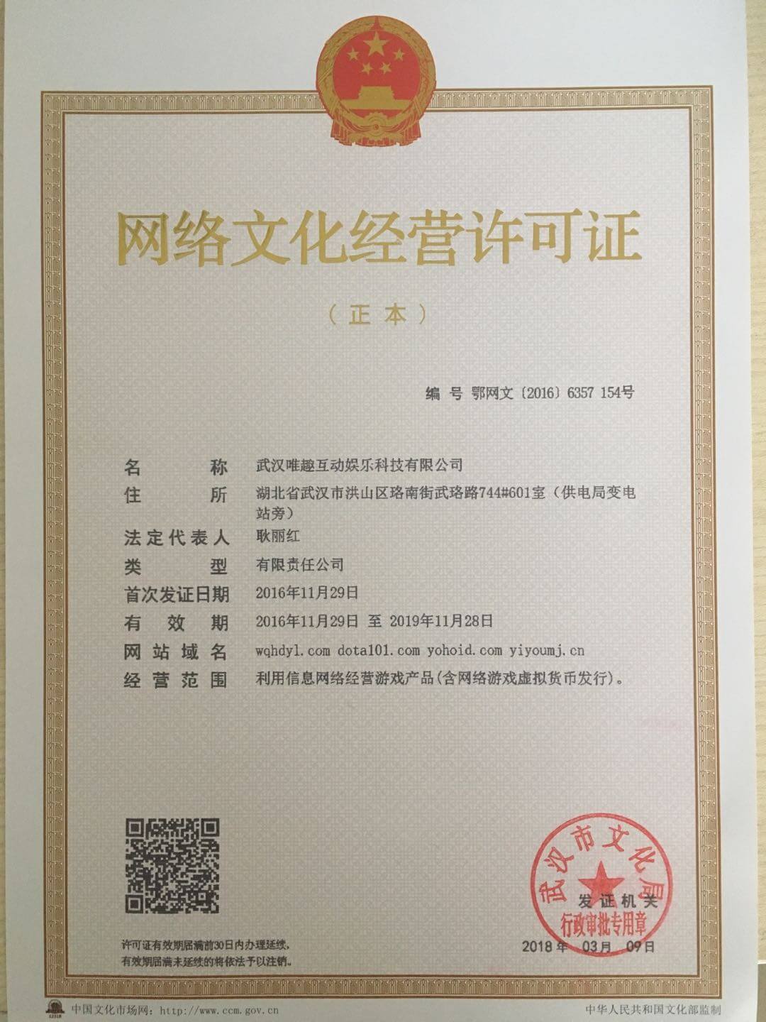 武汉唯趣互动娱乐科技有限公司《网络文化经营许可证》