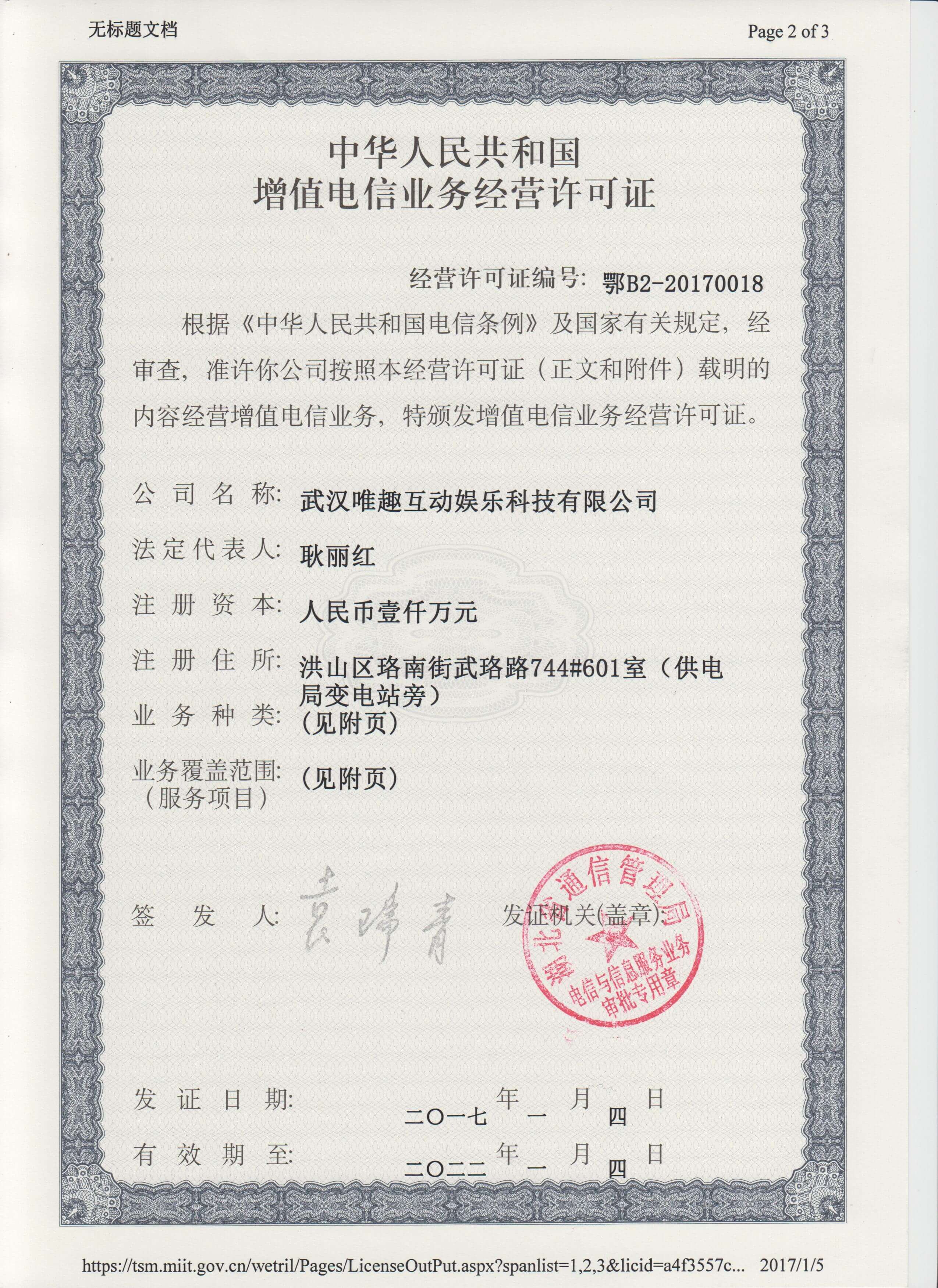 武汉唯趣互动娱乐科技有限公司《增值电信业务经营许可证》